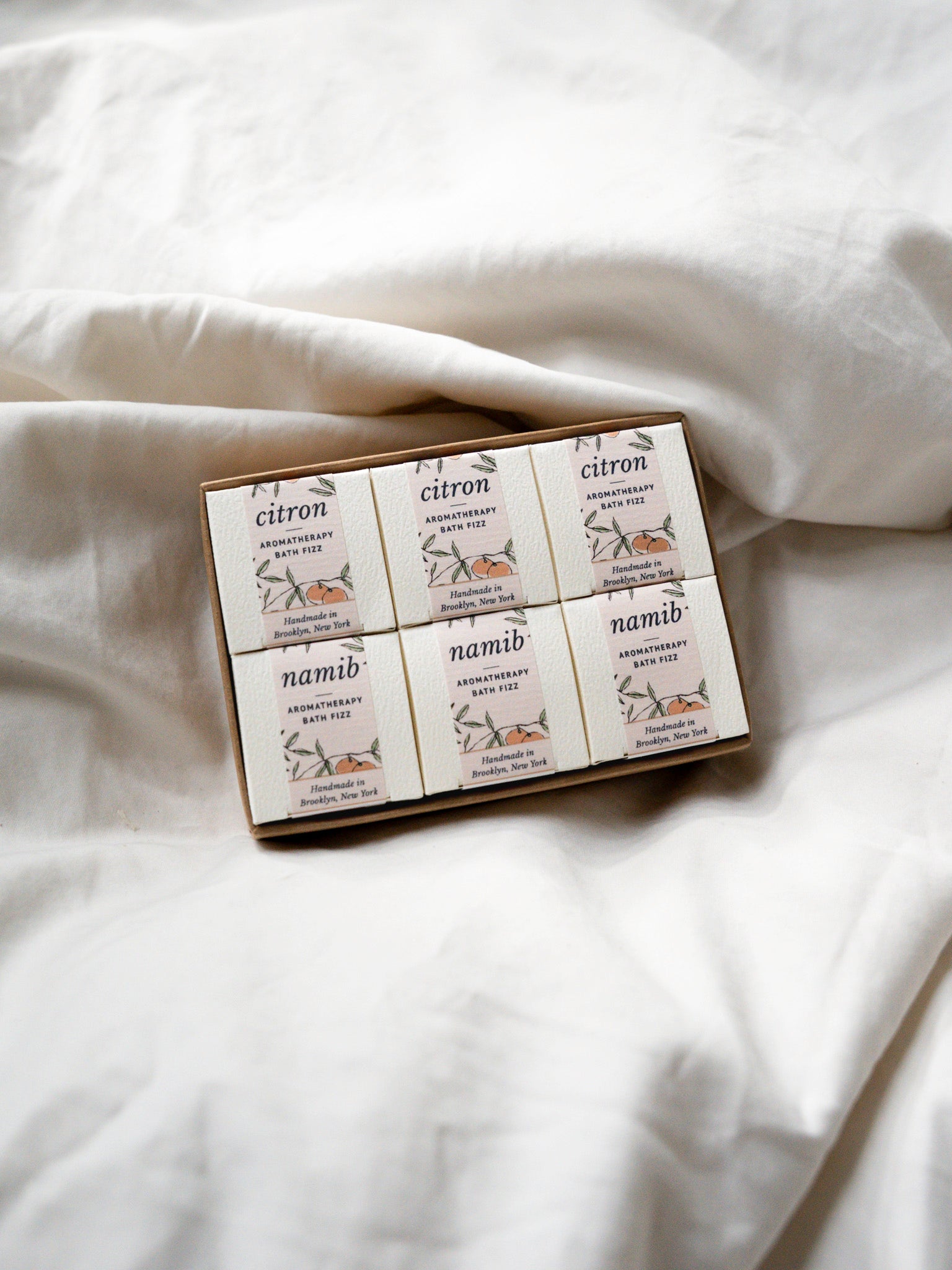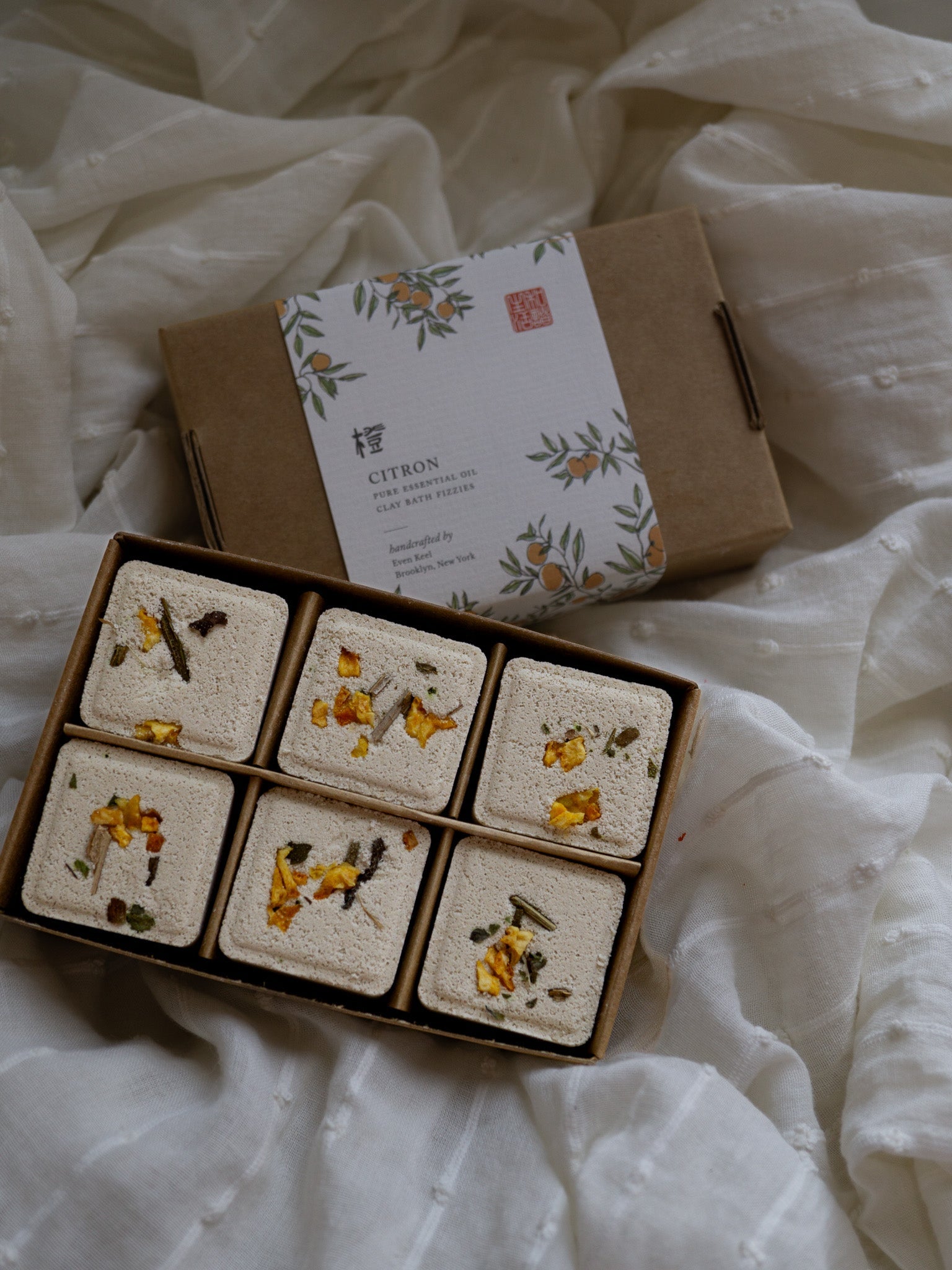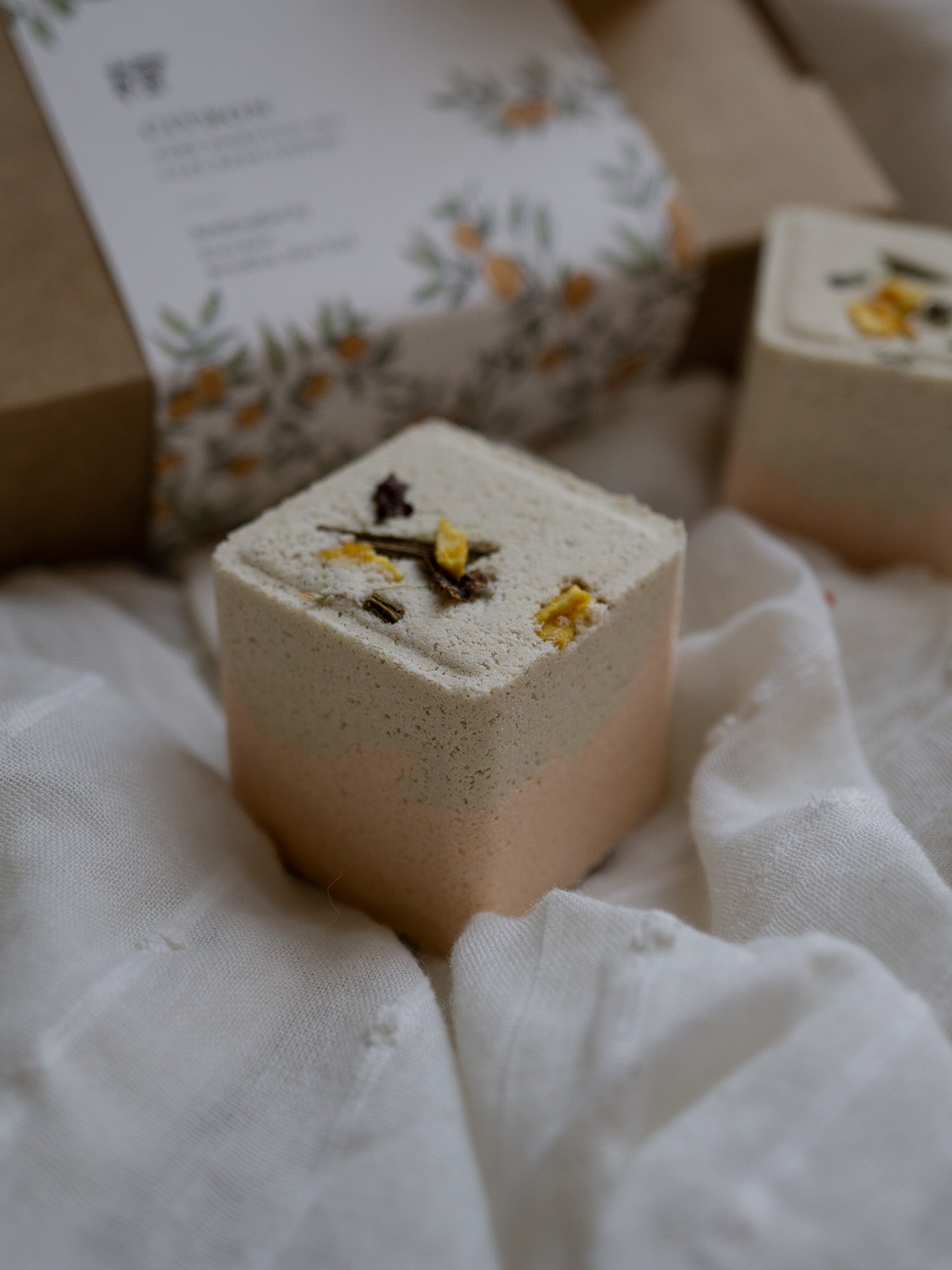 Essential oils (100%), Shea Butter (raw), natural earth clays, Sodium Bicarbonate (baking soda), Citric Acid (food-grade), Botanicals (organic, decorative)