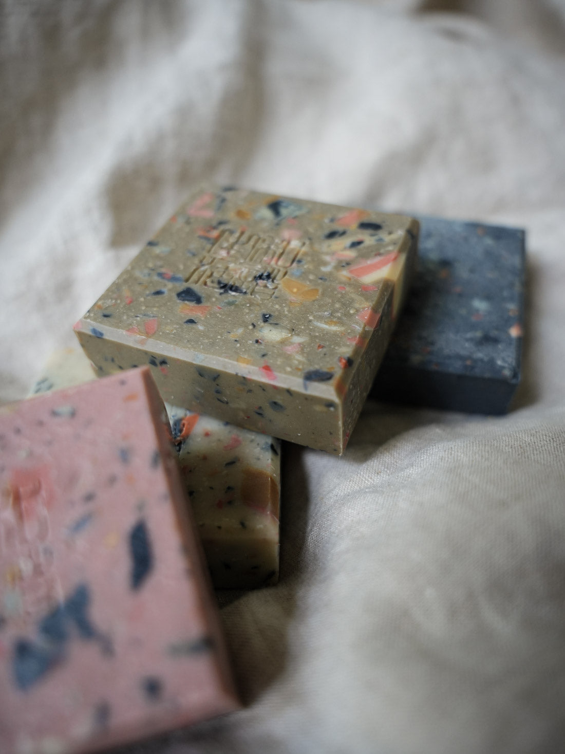 Saponified Avocado oil, Coconut oil, Olive oil, Shea Nut butter (raw),  natural clays (Kaolin),  Essential oils (100%), Comfrey*, Calendula*, and filtered water. *organic herbs infused into oil.